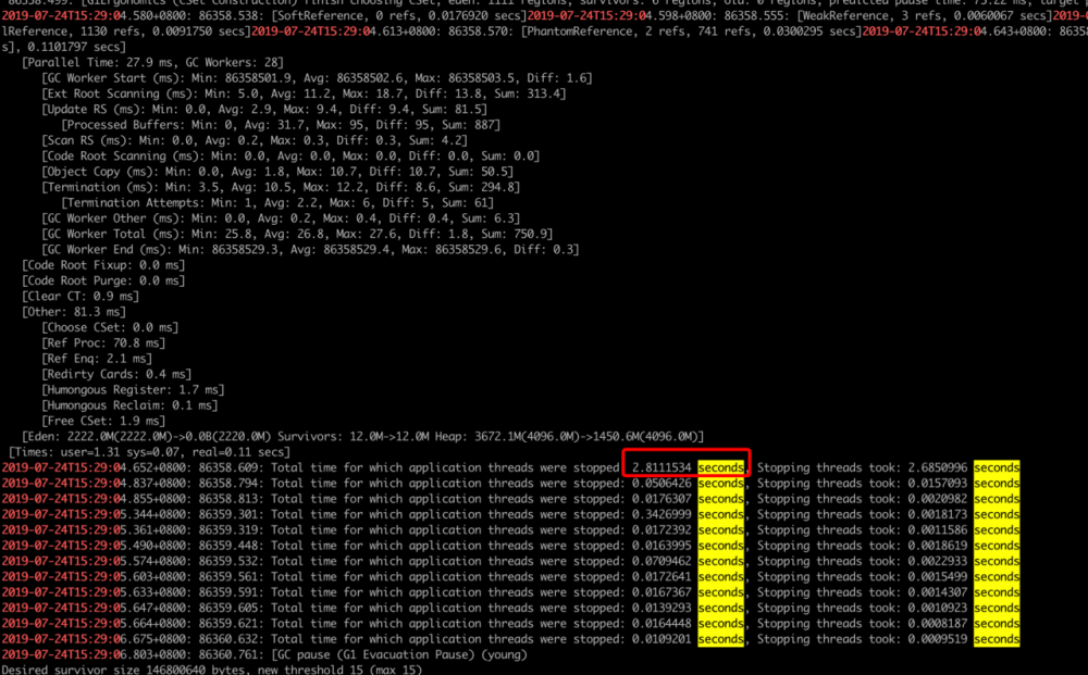 重点:第一个 2.81 seconds 是JVM启动后的秒数,第二个 2.6 seconds 是 JVM发起STW的开始到结束的时间。特别地,如果是GC引发的STW,这条内容会紧挨着出现在GC log的下面。