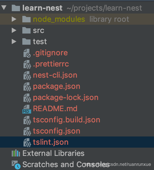 使用WebStorm打开刚刚我们创建的Nest初始化工程,可以看到其目录结构如下: