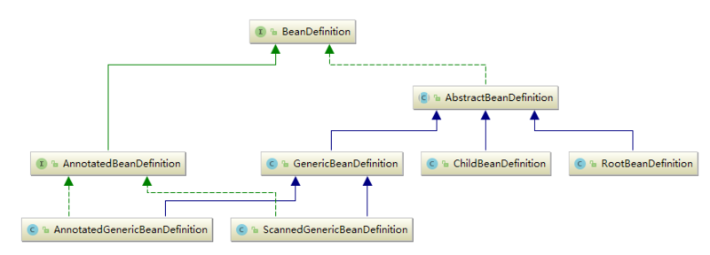 BeanDefinition是一个接口,提供了beanClassName、scope、lazyInit等我们定义的bean的属性。从下面的结构图可以看出,有一个抽象子类AbstractBeanDefinition以及有三种类型的子类,包括GenericBeanDefinition(AnnotatedGenericBeanDefinition和ScannedGenericBeanDefinition)、ChildBeanDefinition和RootBeanDefinition。