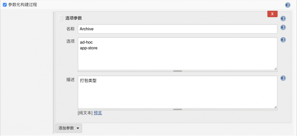 这一块不是重点,我这里只是举个例子,大家根据自己的需求来定制,比如 tage、Debug、Release 等等,就算在不同项目简单修改 shell 脚本达到目的也是 ok 的 选项参数,选项框里填写选项,每个选项换行填写,作用是在下面构建的过程变得比较灵活,例如下图,特别说明下取值为 ${名称} ,例如 ${Archive}