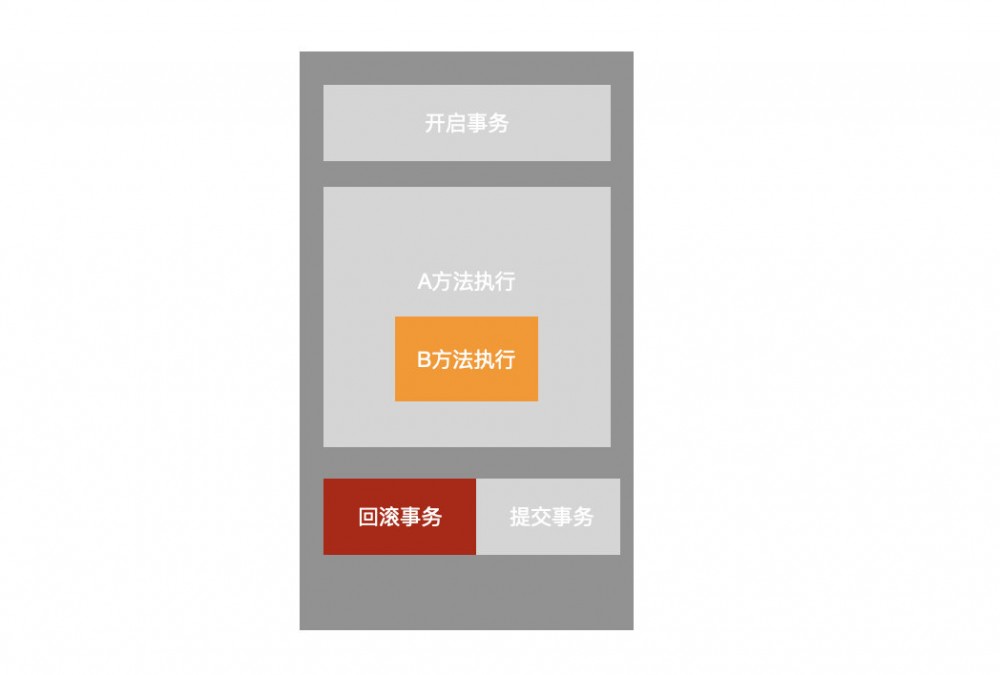 大概嵌套逻辑就像上图一样,但是在B方法执行完成以后抛出了异常,需要回滚,但是并不会真正的回滚,而是将此事务标记为 rollback-only ,当A方法执行完以后,我们可以看到在A方法上面并没有 rollbackFor 这个参数设置,而抛出的异常也是继承了 Exception 所以A方法执行完以后想要提交事务,所以此时就会产生冲突。
