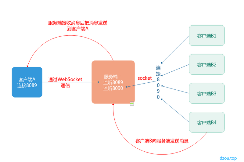 Socket服务端监听8090端口,长连接服务端监听8089端口,客户端A连接到8089端口,客户端B连接到8090端口