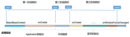 Shooter启动监控采用了无侵入式打点方式,记录了应用启动各个阶段的耗时情况,这里将启动过程分为了三个阶段: