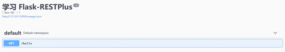 如上所示,文档的标题为 学习 Flask-RESTPlus , 版本为 1.0 , 并且默认渲染资源路由. 有一点需要注意, 如果是使用 Flask 实例 初始化的 Api 对象, 那么文档的 base_url 为 / , 但是如果是使用 蓝图 初始化, 并且在初始化蓝图对象时设置了 url_prefix 参数, 那么文档的 base_url 是挂载到蓝图的 url_prefix 上的. 以下代码表示将文档挂载到蓝图根路由, 即 /api/v1 .