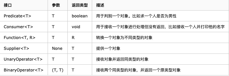 Function , Consumer , Predicate 等。参数类型通过泛型添加。 LongConsumer , DoubleFunction , IntPredicate 等,但基本 Supplier 类型例外。 To 表示,如 ToLongFunction <T> 和 IntToLongFunction 。 UnaryOperator ,两个参数使用 BinaryOperator 。 Bi 。 下表描述了 java.util.function 中的目标类型(包括例外情况):