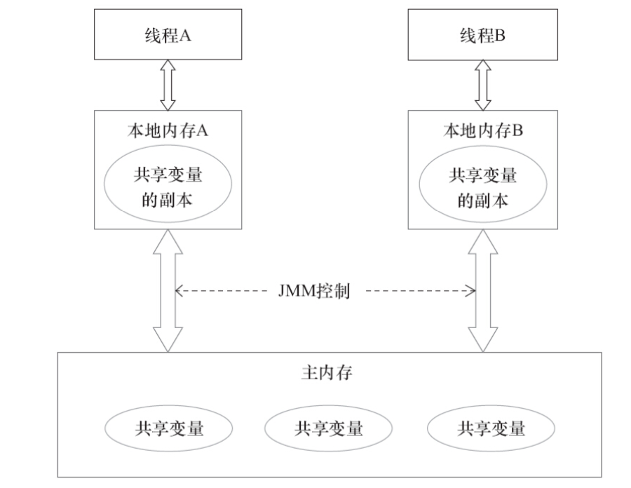 即Java memory model(简称JMM), java线程之间的通信由JMM控制,决定一个线程对共享变量的写入何时对另一个线程可见。