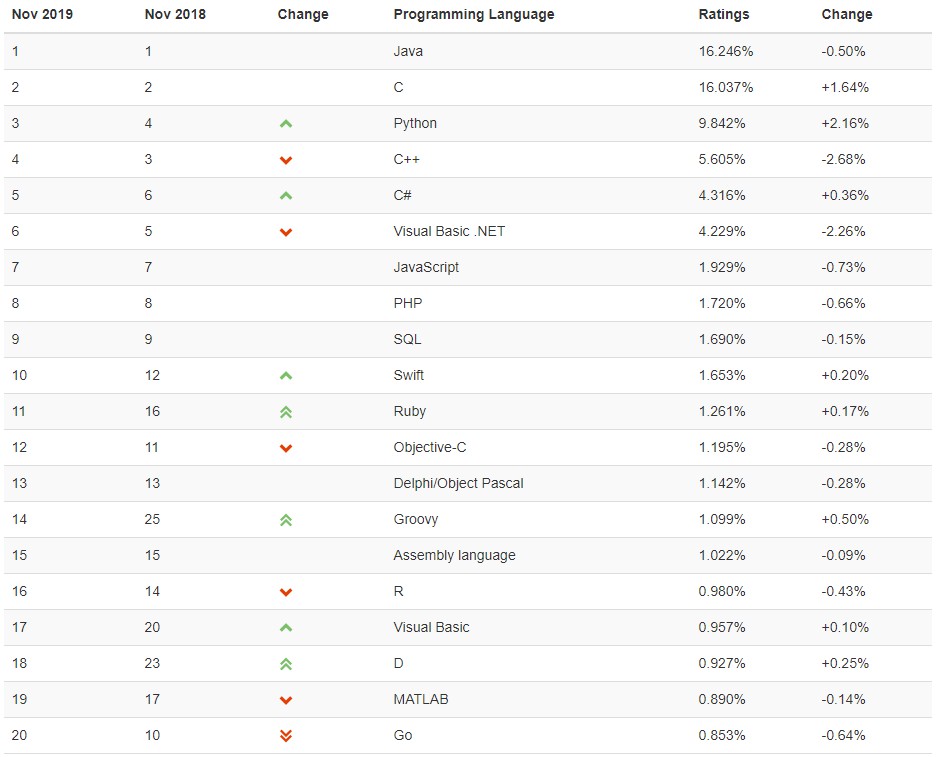 对于学校没有开设,但是自己又想学习的语言而言,该如何去选择。首先,学校开设的语言基本是市场比较流行的语言,也符合市场需求,所以,完全可以在学校开设的语言中去选择自己想要了解并学习的语言。此外,我们可以借助 TIOBE https://www.tiobe.com/tiobe-index/ ( TIOBE 编程社区指数是编程语言流行度的指标,该榜单每月更新一次,指数基于全球技术工程师、课程和第三方供应商的数量。包括流行的搜索引擎,如谷歌、必应、雅虎、维基百科、亚马逊、YouTube 和百度都用于指数计算。 )去了解语言的流行程度,流行程度决定市场需求,以此来参考自己想要了解并学习的语言,在此附上2019年11月语言排名。