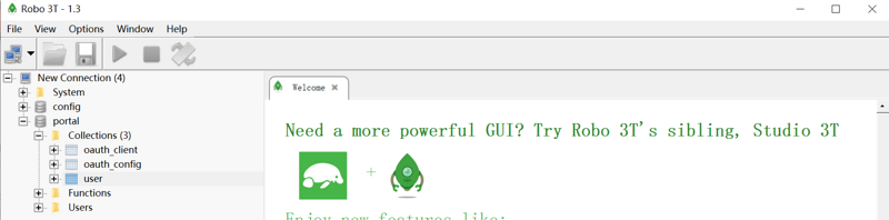 安装完成并启动后,连接服务器上的mongodb。就像我们在mysql数据库里面,先创建数据库,再创建表一样。我们先创建集合,再创建文档,注意,mongodb不需要预设表结构,所以只要填文档的名字就行。如下图,创建了 portal集合下的三个文档,分别是oauth_client、oauth_config、user。