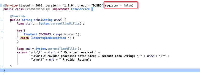 该配置项配置后,服务将不会发布到注册中心,可能很多 Dubbo 用户不会注意到这个配置,它的作用恰恰是 QOS 指令使用的。