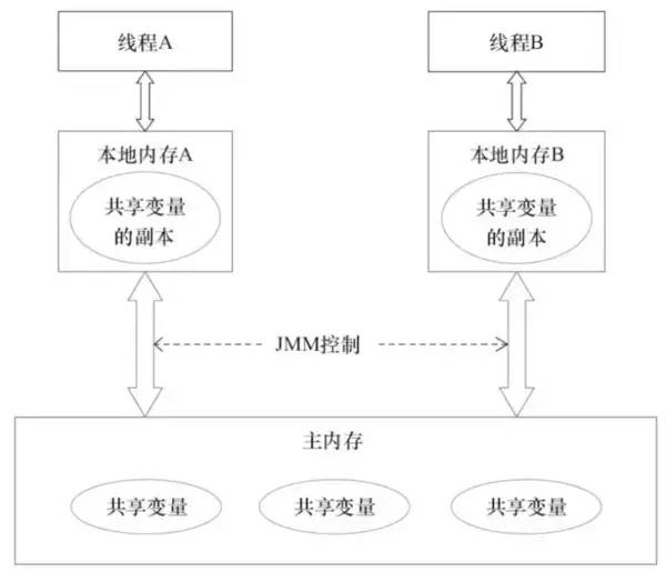Java 内存模型(JMM) 作用于工作内存(本地内存)和主存之间数据同步过程,它规定了如何做数据同步以及什么时候做数据同步,如下图。