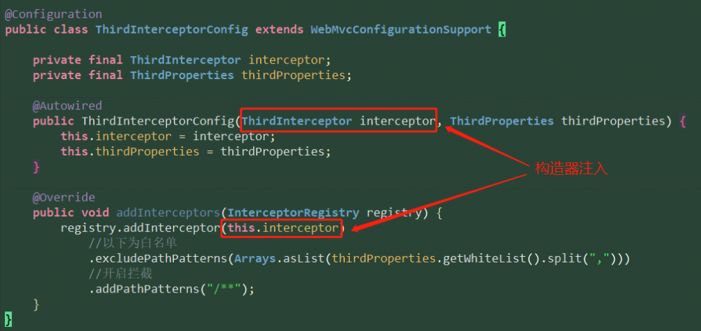 拦截器不加任何自动配置注解,防止Spring自动装配和初始化,并通过构造器显示声明依赖