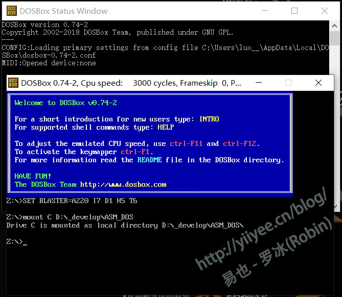 为了访问硬盘上的文件,需要在DosBox下挂载一个分区。打开配置文件dosbox-0.74-2 Options,在最后一行添加:mount C D:/_develop/ASM_DOS,也即将硬盘上的文件夹ASM_DOS挂载为DosBox下的C盘。