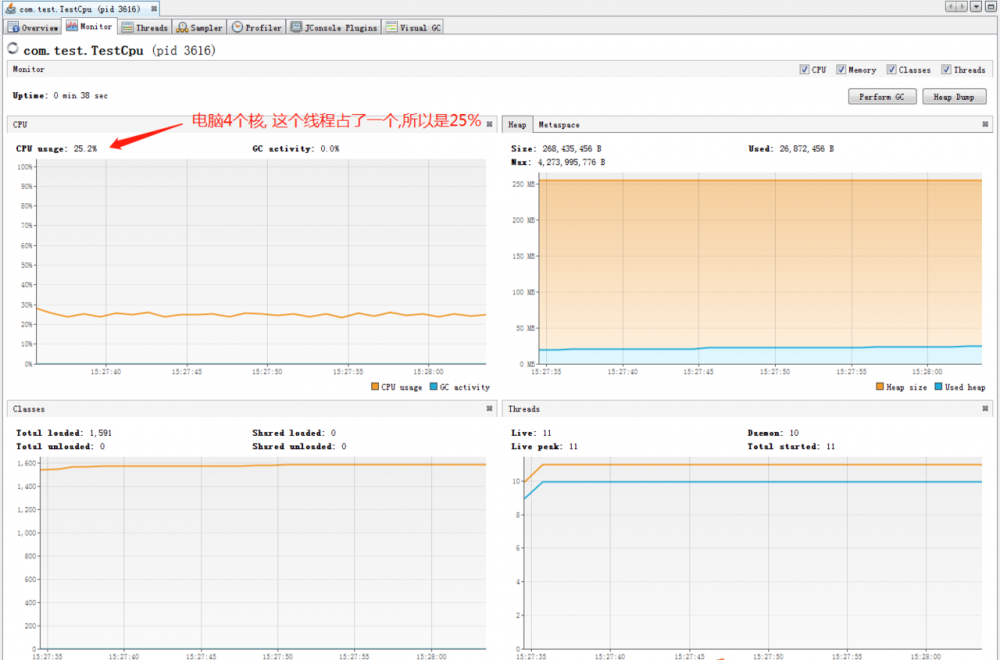 visualvm显示CPU确实消耗了1个核, main线程也是占用了100%的CPU: