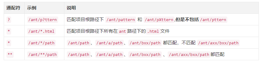 你使用任意合法 uri 字符替代 ? 发现都可以匹配,比如 /bant 。 还有Spring MVC 的一些 过滤器注册、格式化器注册都用到了 Ant 风格。