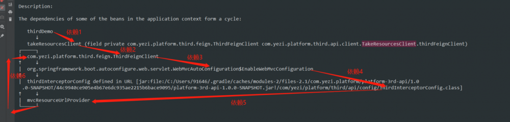 依赖分析的结果可能并不是真正的依赖关系,而是在执行依赖分析的时候出发了某种异常,这个异常的核心是 mvcResourceUrlProvider ,而 mvcResourceUrlProvider 和 FeignClient 加载和拦截器的加载顺序有关,那么要debug找到throw异常的第一现场,看看和 mvcResourceUrlProvider 有没有关系。