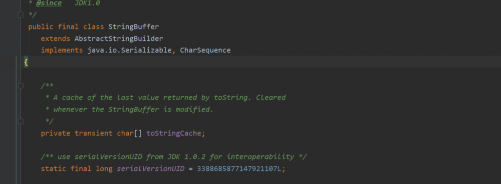 像 String , StringBuffer , StringBuilder 这三个的基本介绍就不多说了,相信大家都清楚,不清楚的可以前往某歌或某度查询(●'◡'●)。 我们先来看下StringBuffer内部的一个大概情况: