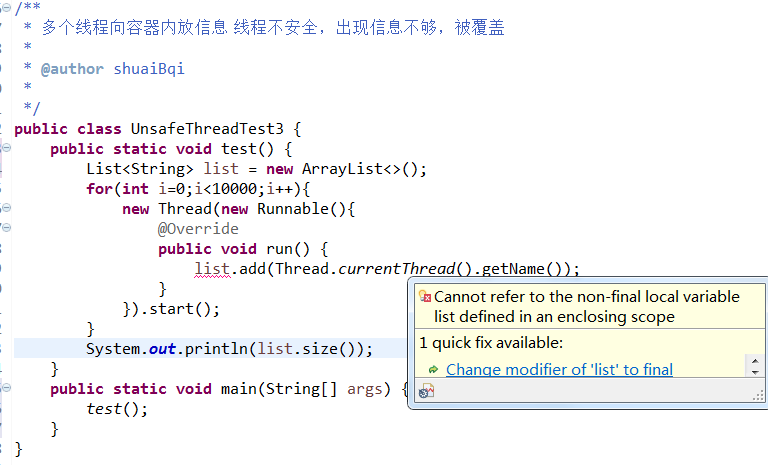 这里的new Runnable(){...}是一个匿名局部内部类,其访问test()方法的局部变量list就会发生编译错误