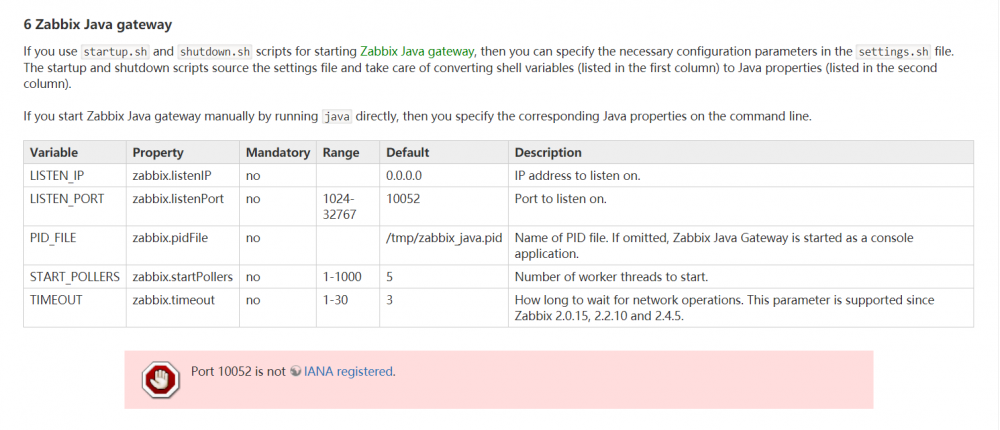 配置文件是 /etc/zabbix/zabbix_java_gateway.conf 文件,文本采取默认配置,配置项详细信息可以参考下图或者参考 官方Zabbix-java-gateway配置项 。