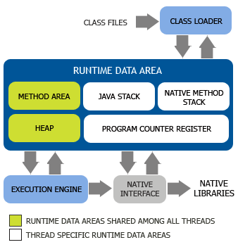 由方法区、堆、Java栈、PC寄存器、本地方法栈组成,其中内存空间中方法区和堆是所有Java线程共享的,而Java栈、本地方法栈、PC寄存器则由每个线程私有。