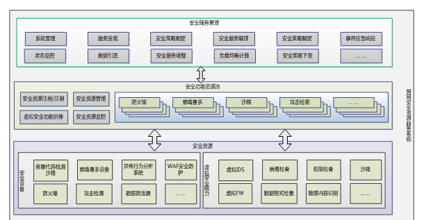 安全功能资源池对安全资源提供注册/注销功能、安全资源分类管理和安全资源状态监控功能,其目的是忽略安全功能的实现差异,将安全功能服务与功能实现进行解耦,使得安全功能服务的调度、功能扩展与重组、服务部署相互独立。