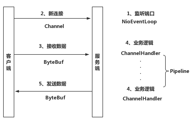 以上四个做为Netty的基本组件,可以理解为Netty把我们之前网络编程中使用到的各部分都进行了优化和高性能的封装,对比到实际的通信流程中,可以简单的用下图直观的表示