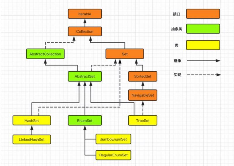 由图中的继承关系,可以知道,Set 接口主要实现类有 AbstractSet、HashSet、LinkedHashSet 、TreeSet 、EnumSet( RegularEnumSet、JumboEnumSet ),其中 AbstractSet、EnumSet 属于抽象类,EnumSet 是在 jdk1.5 中新增的,不同的是 EnumSet 集合元素必须是枚举类型。