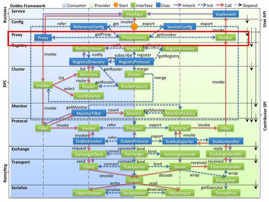 上述稍微回顾了一下静态代理和动态代理,那么dubbo对于动态代理有两种方法实现,分别是javassist和jdk。Proxy 层封装了所有接口的透明化代理,而在其它层都以 Invoker 为中心,只有到了暴露给用户使用时,才用 Proxy 将 Invoker 转成接口,或将接口实现转成 Invoker,也就是去掉 Proxy 层 RPC 是可以 Run 的,只是不那么透明,不那么看起来像调本地服务一样调远程服务。我们来看看下面的图: