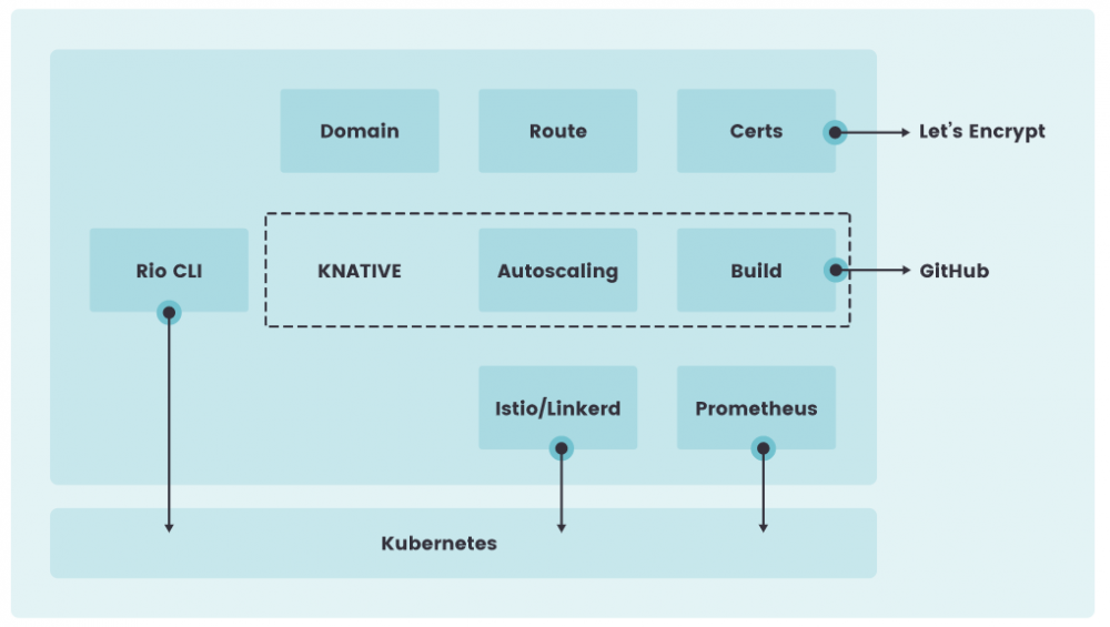 Rio采用了诸如Kubernetes、knative、linkerd、cert-manager、buildkit以及gloo等技术,并将它们结合起来为用户提供一个完整的应用程序部署环境。