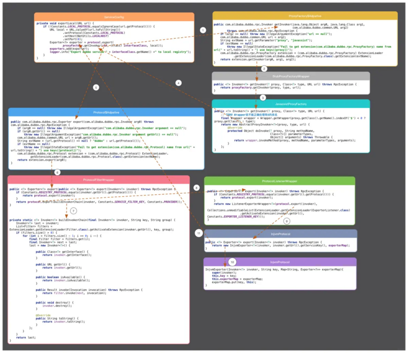 比如图中的1-4就是对应具体服务到invoker的转换,5-11对应Invoker转换为Exporter