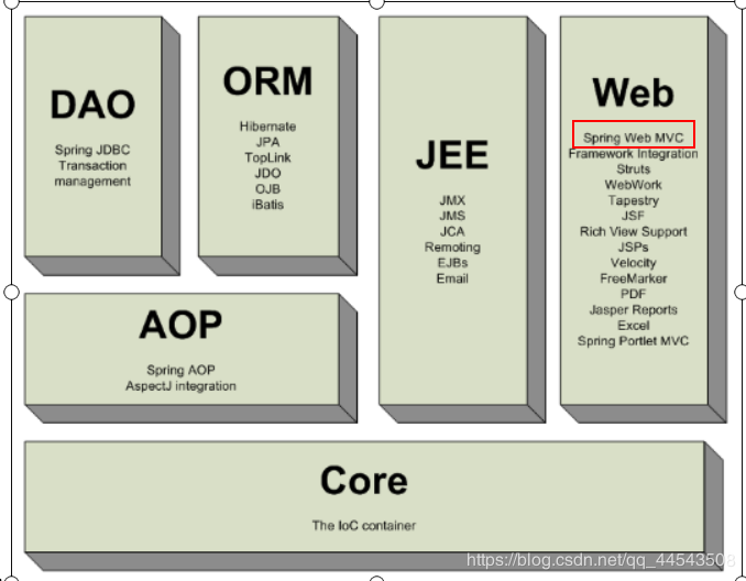 Spring web mvc和Struts2都属于表现层的框架,它是Spring框架的一部分,我们可以从Spring的整体结构中看得出来,如下图: