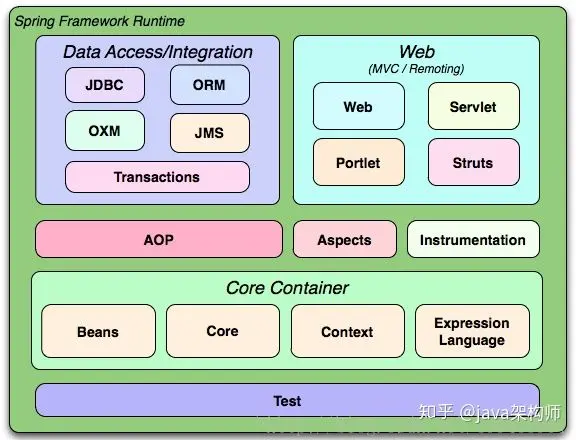 如下图所示,整个spring框架按其所属功能可以划分为五个主要模块,这五个模块几乎为企业应用提供了所需的一切,从持久层、业务层到表现层都拥有相应的支持,这就是为什么称Spring是一站式框架的原因。