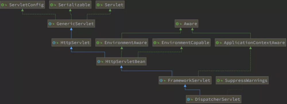 一次完成的请求流程就是请求--->处理--->响应,业务逻辑处理最终交由我们创建的Servlet来进行处理。以前在使用Spring MVC框架的时候,我们都会在web.xml中配置一个DispathcherServlet。接下来就让我们来看看DispathcherServlet的类图
