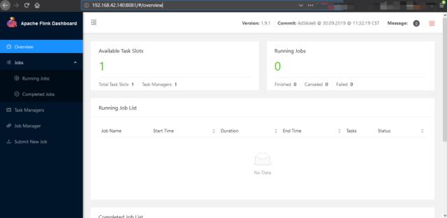首先下载Apache Flink 1.9.1安装包并进行解压,之后进入bin文件夹内运行./start-cluster.sh启动环境,浏览器访问http://ip:8081验证是否成功,如下图所示: