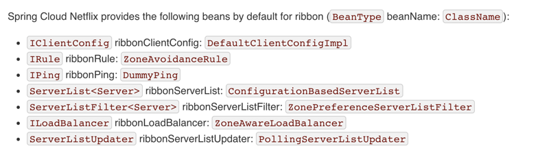 这些属性中定义的类优先于使用定义的bean @RibbonClient(configuration=MyRibbonConfig.class)和Spring Cloud Netflix提供的默认值。