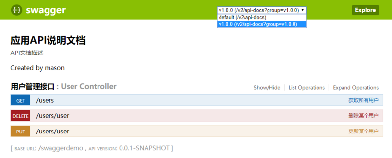 经过上面的处理,显示的接口界面有两个分组,一个是default,一个是指定的版本号(v1.0.0),指定版本显示的接口即是当前版本变更或新增的接口描述,如下: