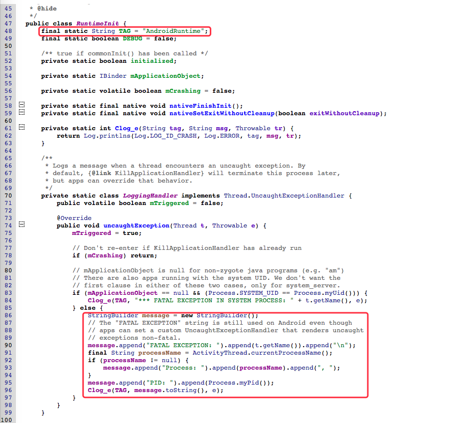 当Android项目中出现未捕获异常时,Logcat中默认会自动有异常堆栈信息输出,且信息输出的前缀为: E/AndroidRuntime: FATAL EXCEPTION: 。我们很容易猜想到,这应该是系统层直接输出的,搜索framework源码,很快可以找到具体输出日志的位置: