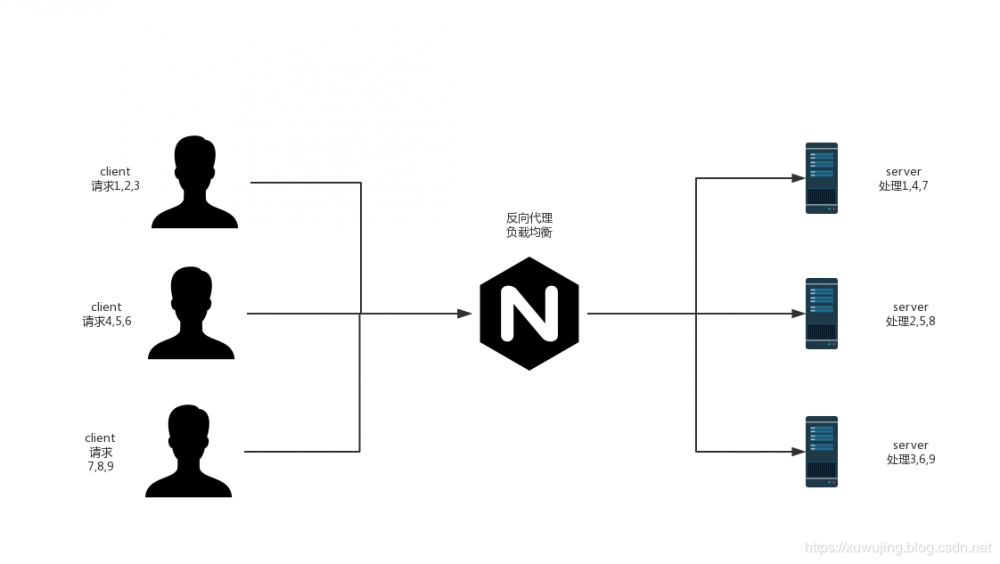 Nginx实现负载均衡的示例图:
