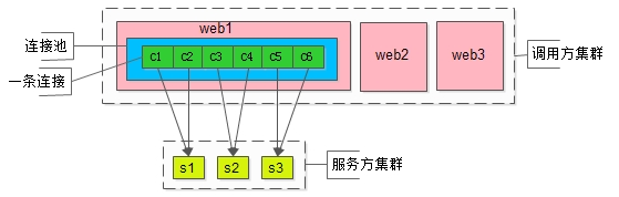 此例中,一个调用方会与一个服务节点建立2条连接,服务集群共3个集群,故连接池总共6条连接,从c1到c6。