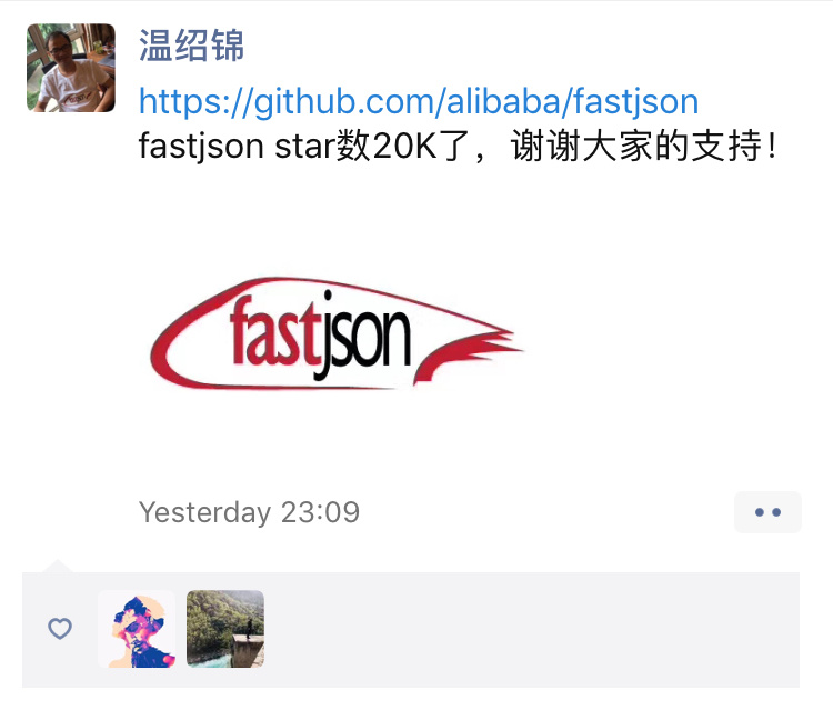 昨晚,阿里开源库 fastjson stars 数达到了 20k, 温绍锦 (花名: 高铁 )作为fastjson、Druid 的作者,发了条朋友圈,表示感谢大家的支持。