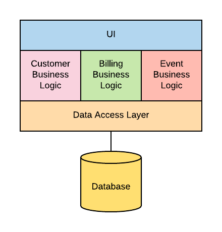 在早前的软件开发中(以及当前的许多企业环境中),诞生了Monolith的概念。Monolith是一个应用程序,包含了完整的功能集合,在一个地方提供服务,并存储所有内容。它看起来就像这样:
