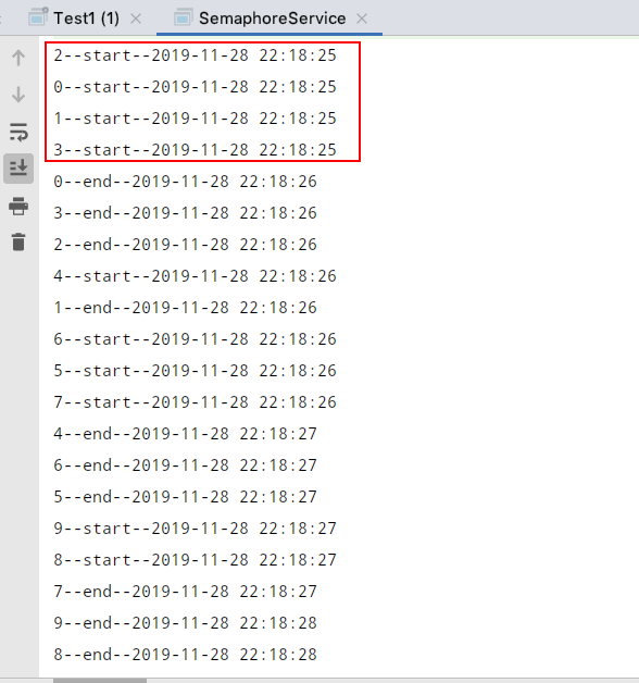//1,设置信号量数为4,执行结果如下图 private Semaphore semaphore = new Semaphore(4);