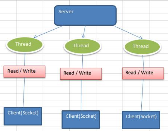 同步并阻塞模型,服务器会为每一个连接建立一个线程,如果连接过多,且线程不做任何事情,会极大的浪费资源,示意图如下: