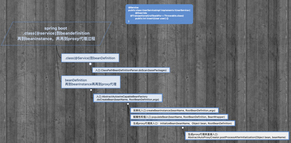 首先看一张图,下图展示了 .class文件生成beanDefinition 与 beanDefinition生成beanInstance 与 beanInstance生成proxy代理类的入口 ,有了此图,走源码时可以结合debug直接定位你要关注的细节。节省你和你寻找的知识点见面的时间