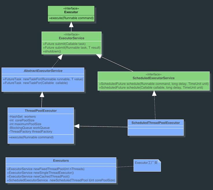 **Executors:**这是一个静态工厂类,该类定义了一系列静态工厂方法,通过这些工厂方法可以返回各种不同的线程池。
