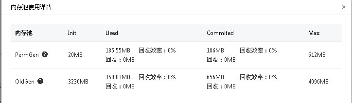 通过JVM内存使用情况可以确认,本次FullGC,PermGen、OldGen回收效率均为0%,说明虽然触发了FullGC但是由于并未到达上述2/3两种原因,因此可以再次确认是由于代码中显示调用System.gc引起的,在把代码注释掉之后再次验证,未出现FllGC情况;