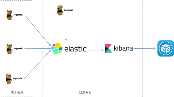 将logstash部署到每个节点,收集相关的日志,并经过分析过滤后发送到elasticsearch进行存储,elasticsearch将数据以分片的形势进行压缩存储,通过kibana对日志进行图形化的展示。