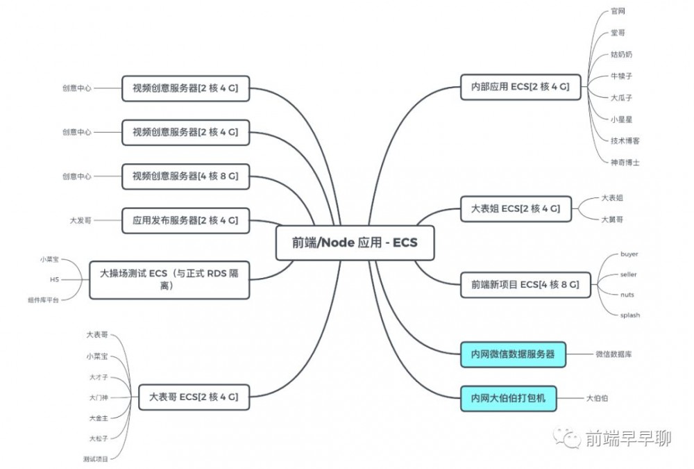 显然每个人的偏好都不同,代码质量也不同,工程架构方式也不同,这为后期的维护带来巨大的麻烦,尤其是做 Node 监控时候,发现没法用一套方案做批量的部署,也同样不能做水平的快速扩展,需要挑选一个框架基于它做统一的封装,从而把前端参与的所有服务端建设可以统一起来,而且现实是我们的前端和 Node 应用由于整个工程的构建与服务部署方式的不同,已经散落到各个服务器上,导致维护成为了瓶颈,也必须到做出改变的时候了,这是当时的部分零散的应用图: