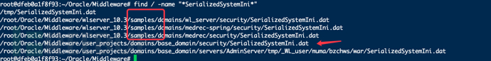 一个domain里面只会有一个这个文件,如果一个weblogic下有多个domain,可能会出现多个 SerializedSystemIni.dat 文件,这时候可以通过find一下就可以。由于系统有个自带sample目录也有该文件,所以出现多个结果,稍微分辨一下就可以。