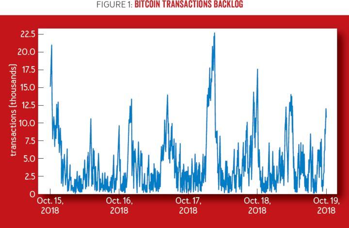 在解释区块链可扩展性问题之前,我们先看看区块链系统的性能表现如何。图 1 和图 2 显示了比特币和以太坊这两种主流密码学货币的交易积压情况。你可以看到,成千上万的交易等待着被写入区块链。为了增加被矿工选中 「上链 " 的可能性,用户(自愿)增加了交易费。因此,在交易拥堵期间,交易费可能会大幅增长。