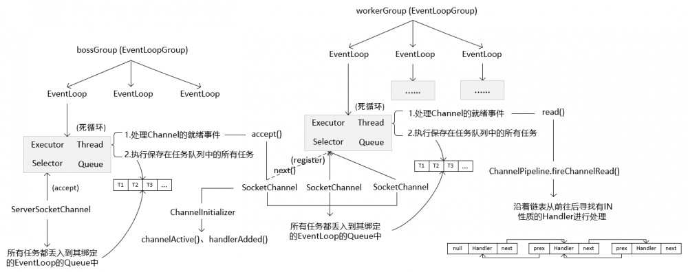 BossGroup中的EventLoop中的Thread正在死循环的处理Channel的就绪事件以及执行保存在任务队列中的所有任务